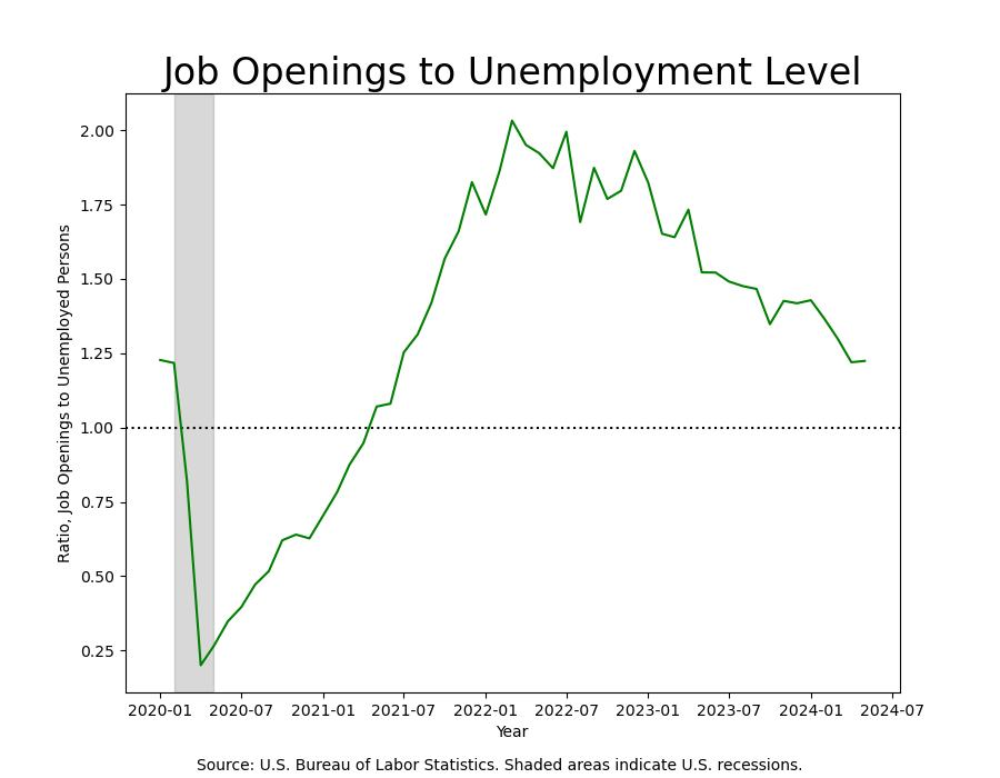 Combining this measure of the demand for labor with a measure of supply of labor (as measured by the number of unemployed), we can derive a ratio that indicates how well supply and demand are balanced in the labor market. A reading of one indicates perfect balance, whereas a reading above one indicates labor market tightness. This ratio currently sits at about 1.25.