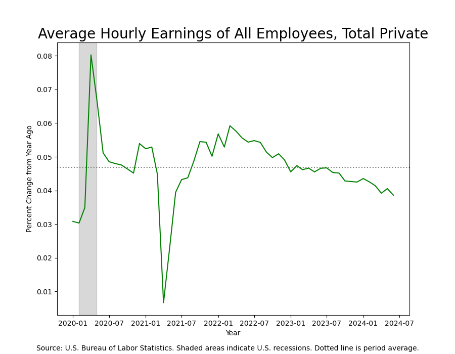 The downward trend portends a labor market approaching equilibrium. If this is true, then we should observe the wage rate (the price of labor) to be falling. And that is in fact what we do observe. Average Hourly Earnings, our measure of the wage rate, continues to drop off. This relieves cost pressures on corporations and has been one of the more worrisome drivers of sticky inflation over the post-pandemic period.