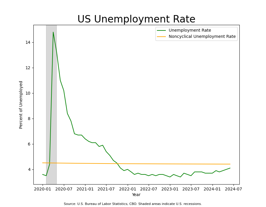 The Unemployment Rate increased by .1%, and remains below the Noncyclical Rate, indicating that the labor market is still tight.